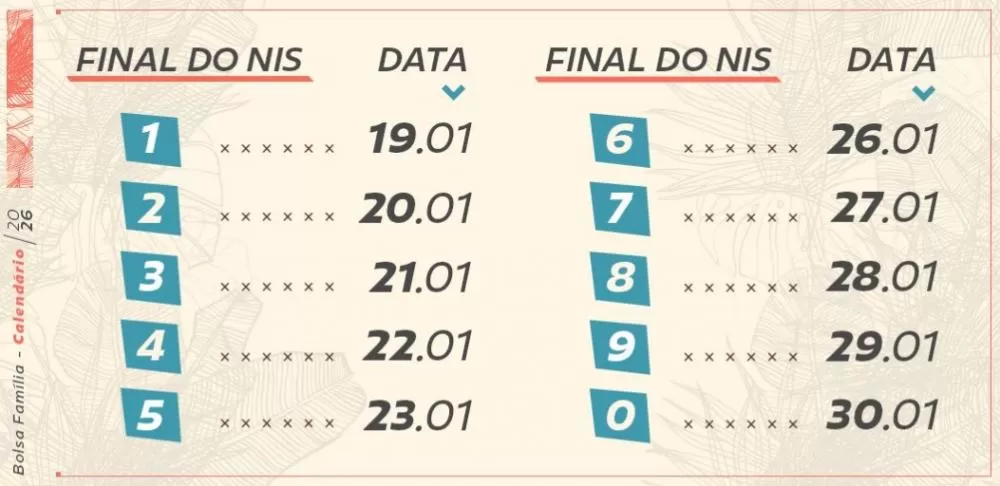O pagamento do Bolsa Família segue o calendário escalonado, de acordo com o último dígito do Número de Identificação Social (NIS), encerrando com o NIS final zero no dia 30 de janeiro.