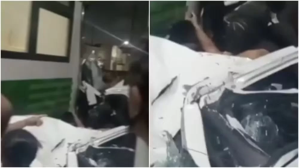 Com o impacto, o carro foi partido e prensado contra um muro.