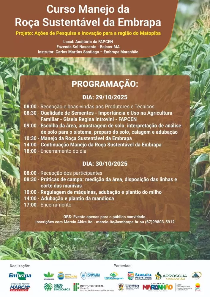 A Embrapa Maranhão e a FAPCEN (Fundação de Apoio à Pesquisa do Corredor de Exportação Norte) promovem, nos dias 29 e 30 de outubro, o curso “Manejo da Roça Sustentável” em Balsas (MA). O evento tem como objetivo capacitar produtores e técnicos da região para adotar um modelo de agricultura mais eficiente, produtivo e ambientalmente correto.