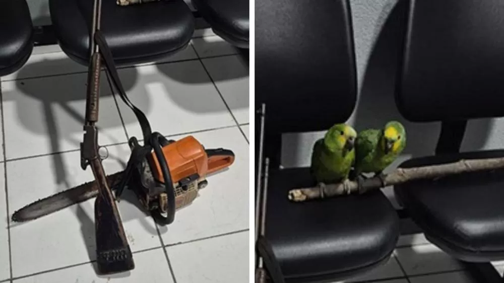 A ação ocorreu após uma denúncia anônima. Um homem, apontado como o responsável pela derrubada de árvores, foi preso em flagrante por porte ilegal de arma. A arma, uma motosserra e dois papagaios mantidos com as asas cortadas foram apreendidos.