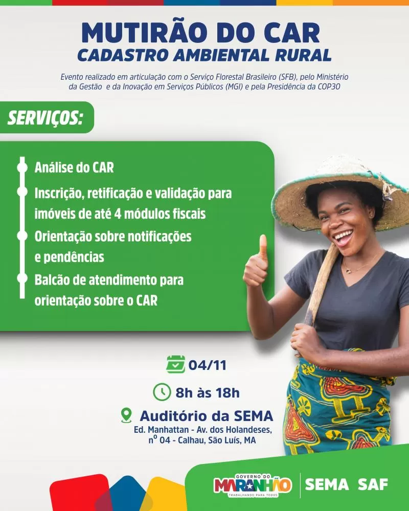 O estado do Maranhão realiza nesta terça-feira (4) um mutirão de atendimento voltado à regularização ambiental de imóveis e cadastros rurais. A iniciativa faz parte dos Mutirões do Código Florestal, uma ação inédita e simultânea em todos os estados do Nordeste, além do Rio Grande do Sul e Santa Catarina, com o objetivo de avançar na implementação das agendas estaduais de sustentabilidade.